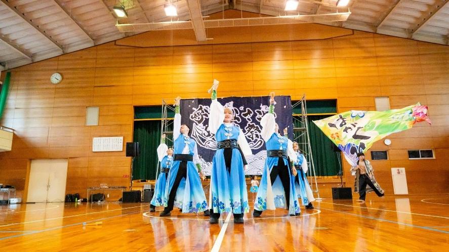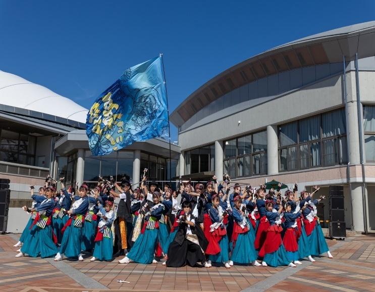 私たちは佐賀市で活動しているよさこいチームはがくれと申します。呼子はメンバーみんな大好きな地でこのお祭りに参加するのがとても楽しみにしてました。青い海を背に私たちの楽曲あおいろを爽やかに演舞したいと思います。よろしくお願いいたします。